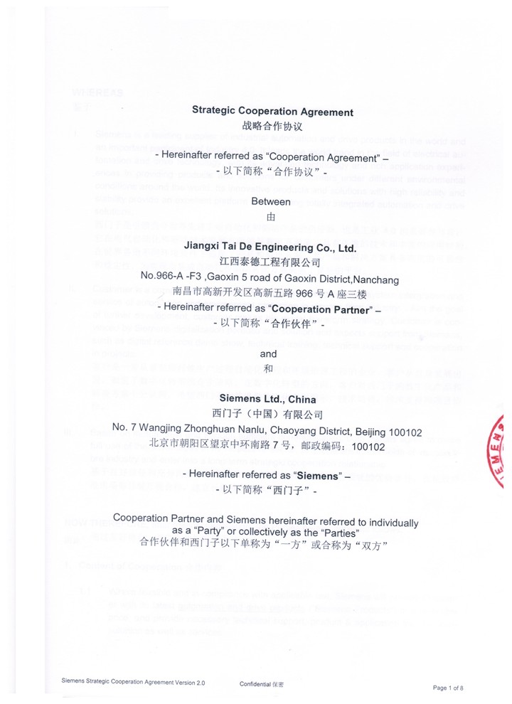 首頁 > 企業(yè)資質(zhì) > 企業(yè)資質(zhì) > 西門子戰(zhàn)略合作協(xié)議